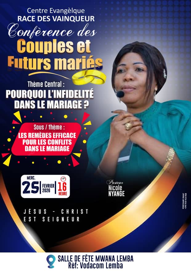 La pasteure Nicole Nyange, de l’Église Centre évangélique ministère la race des vainqueurs, annonce la tenue de la troisième édition de la Conférence des couples et futurs mariés, prévue le mercredi 25 février à partir de 16 heures, dans la salle Mwana Lemba, à Kinshasa.